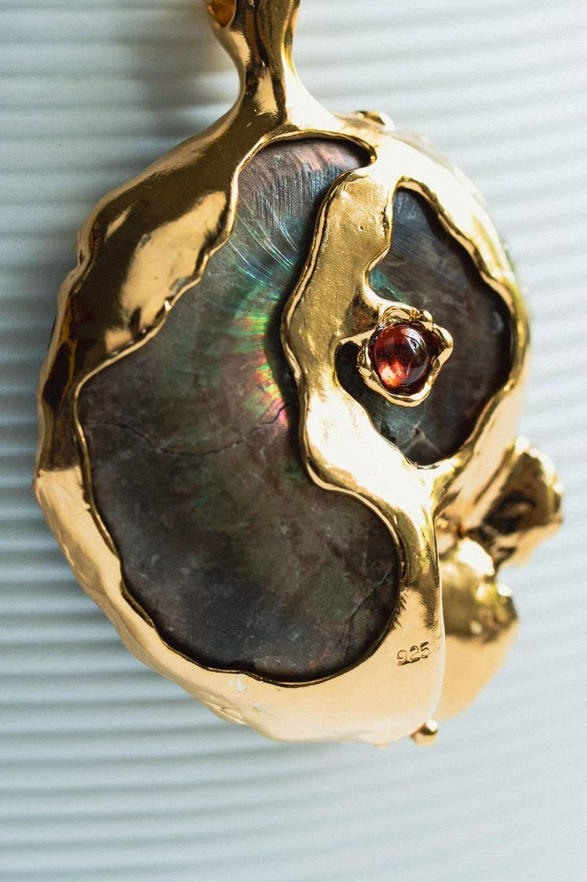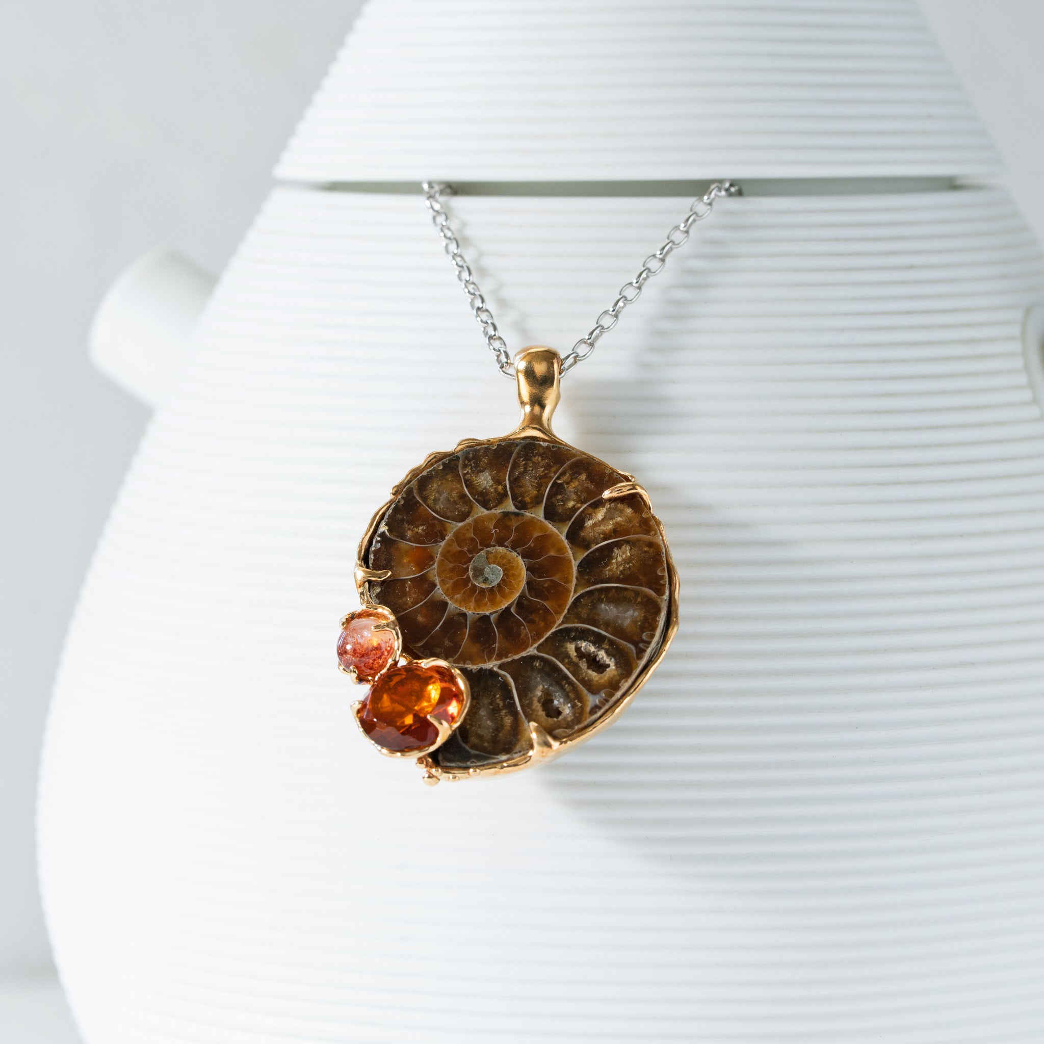 こちらはアンモナイトの化石と琥珀とレピドクロサイト、裏側にガーネットを組み合わせた、