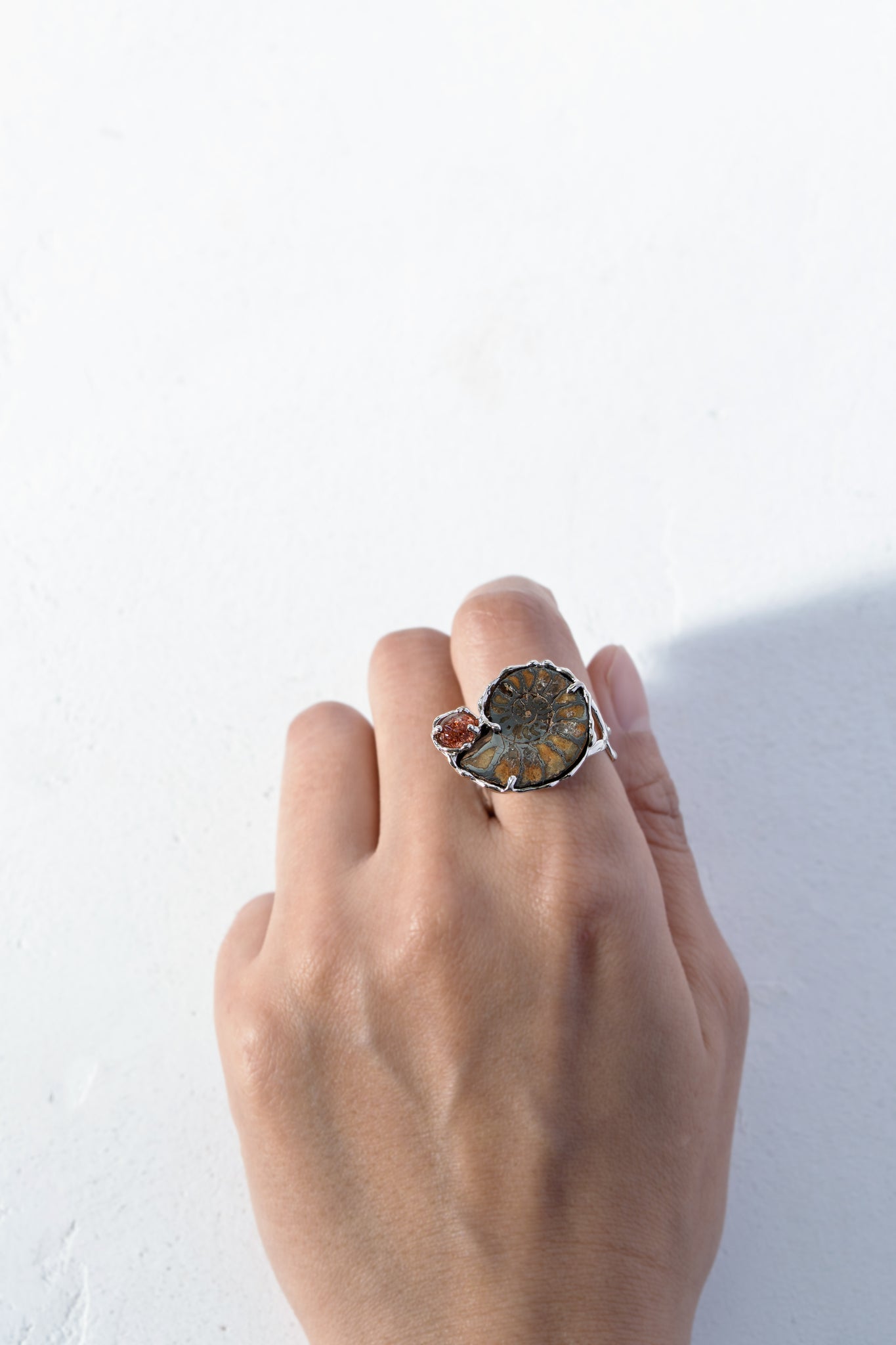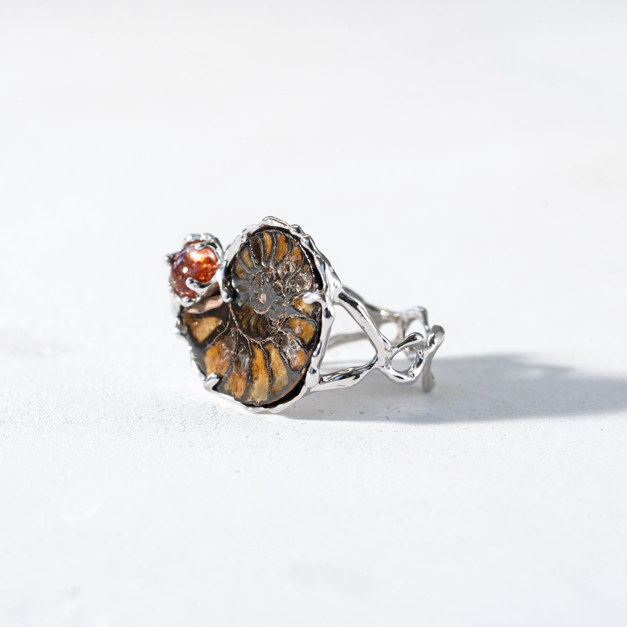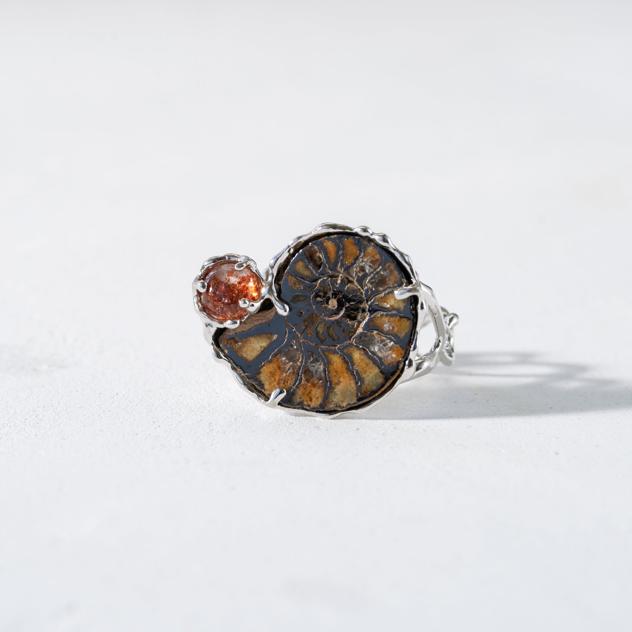こちらはアンモナイトの化石とレピドクロサイトを組み合わせた、