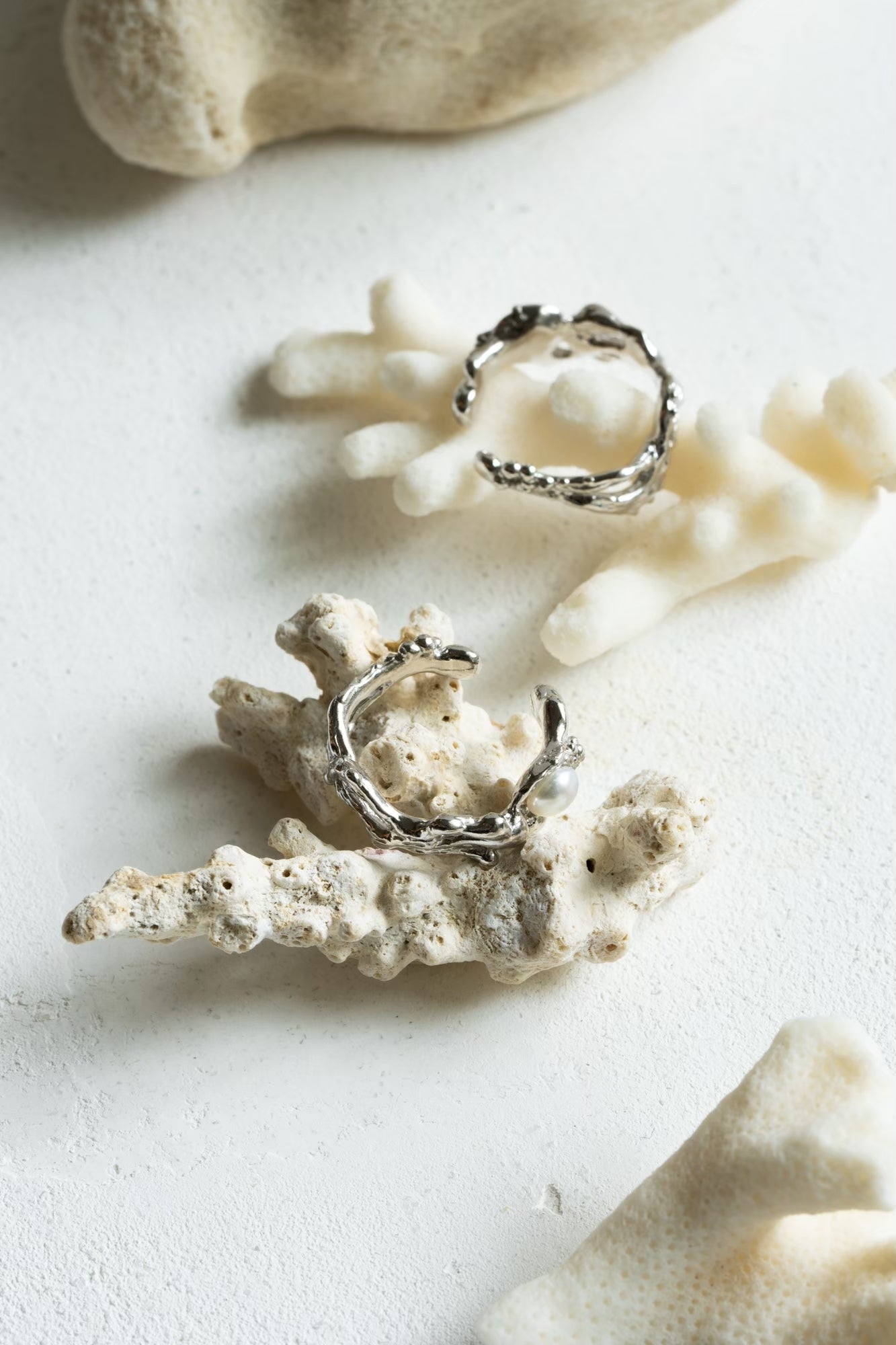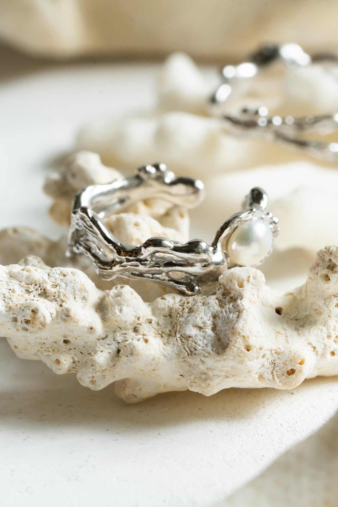 海中でゆれるハナサンゴをモチーフとした片耳用イヤーカフに真珠をあしらいました。